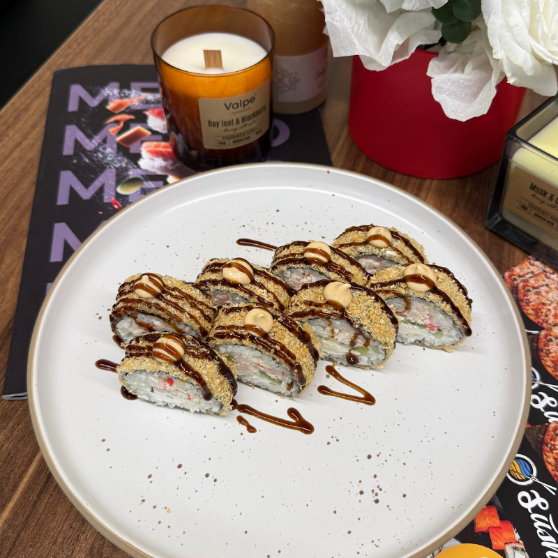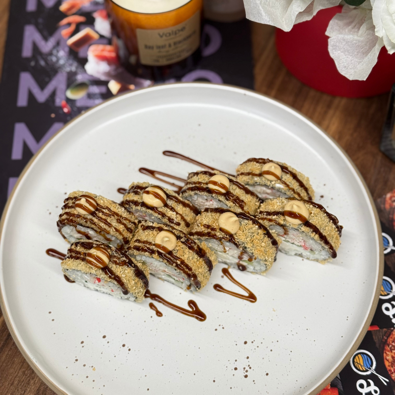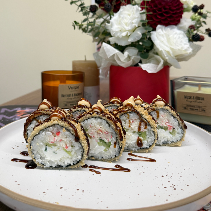 🐟🍤🥑Складові ролу: сніжний краб (сурімі, японський майонез), вершковий крем-сир, огірок, соус спайс, соус унагі, рис для суші, норі, борошно темпура, сухарі панко, олія соняшникова для фритюра